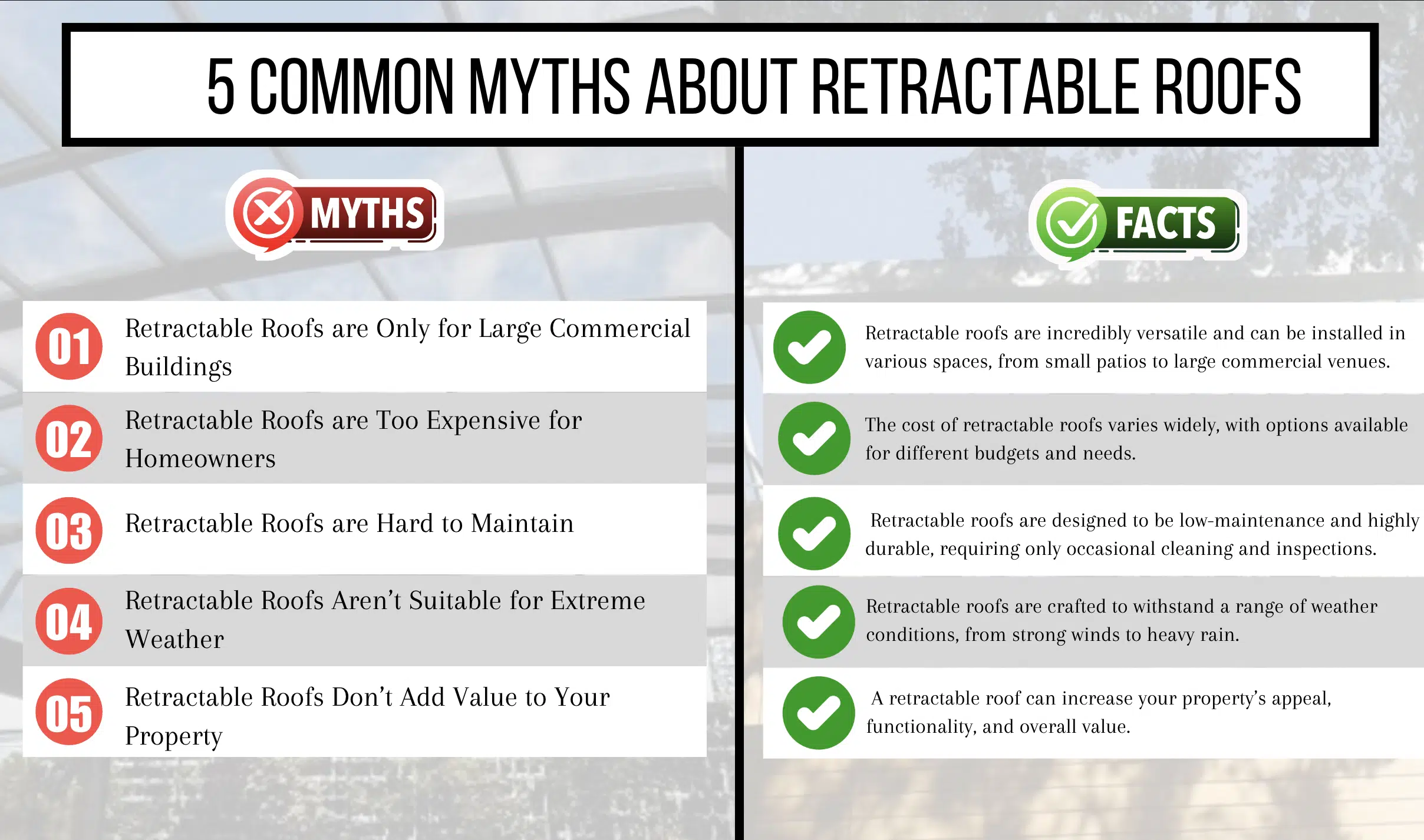Retractable roofs are becoming a popular choice for both residential and commercial spaces, thanks to their flexibility, style, and functionality. However, several myths still surround this innovative roofing solution. If you’re considering adding a retractable roof to your space, it’s essential to separate fact from fiction. In this article, we’ll debunk five common myths about retractable roofs and provide the real facts to help you make an informed decision.